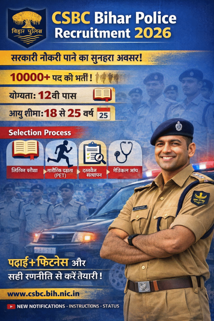 The CSBC Bihar Police Recruitment 2026 is a golden opportunity for all candidates seeking a government job, particularly a career in the police department. This recruitment process, conducted by the Central Selection Board of Constable (CSBC), is completely transparent and merit-based. Millions of candidates apply for this exam each year, so accurate information and timely preparation are crucial. This recruitment process fills various constable positions in the Bihar Police.